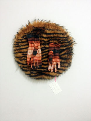 Color is also symbolic and meaningful. The color of human skin often responsible for exclusion, oppression, even annihilation, is represented several times through a special multi-colored fabric, symbolically integrating all human skin colors, used for the lower part of “Stoned Consciousness”. It looks a bit fashionable (and actually it was made of fabrics used for bathing suits), but this fabric carries a serious message, the appeal that we all belong to the same mankind. A pair of gloves made of the same multi-racial textile is applied to some tiger skin imitation. Besides the inviting visual effect it delivers the message that people living in precarious living situations should better keep together in their struggle for survival. And that it needs courage and power for achieving that. Textile fabric represents the social fabric between people, the point that Franziska Fennert concerns tremendously.