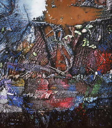 Fragmen warna disusun Erizal AS lewat bahasa visual bertingkat, menghadirkan lanskap yang tumbuh dari pergesekan dan keselarasan. Tekstur serta struktur cat memperlihatkan alam sebagai proses yang terus bergerak dan saling terhubung. Pada ruang refleksi personal, Ricky Qaliby memaknai gunung sebagai pengingat tentang keseimbangan dan kedalaman diri. Lanskap menjadi cermin hubungan antara manusia, alam, dan kesadaran yang berkembang perlahan.
